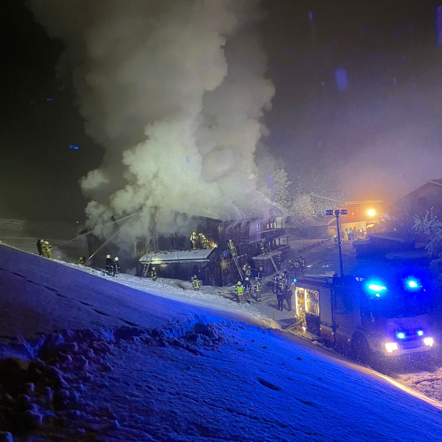 Zusammen mit unseren Nachbarfeuerwehren Auffach, Niederau, Wörgl, Kundl, Kirchbichl, Hopfgarten i. B., Kufstein und dem Drohnenteam des BFV Kufstein, konnte das komplett aus Holz gebaute Haus bis auf den Stallbereich gerettet werden.💪